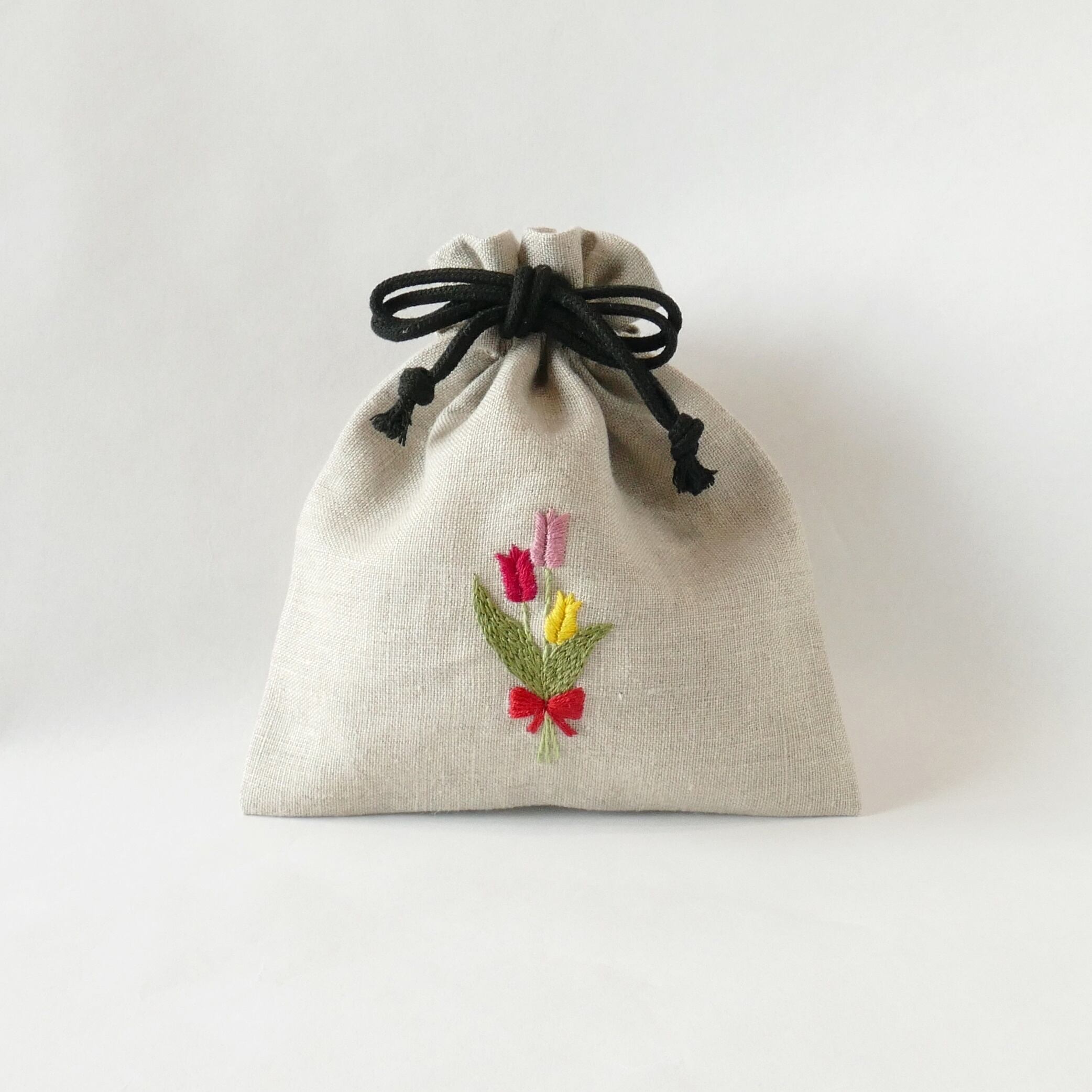〚字入れ〛リネンの手刺繍巾着ポーチ*チューリップ